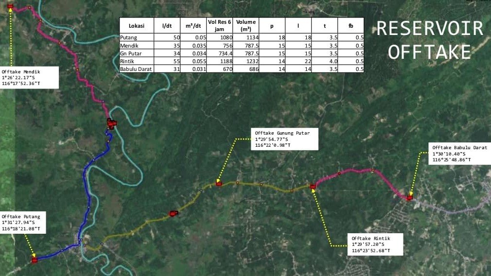 Berdasarkan review Detail Engineering Design (DED) SPAM Regional Long Kali, sumber air baku akan berasal dari Sungai Telake. Sistem ini akan mencakup dua reservoir utama, yaitu Rintik dan Babulu Darat. Reservoir Rintik akan melayani Desa Rintik, Gunung Intan, Gunung Makmur, dan Gunung Mulia.