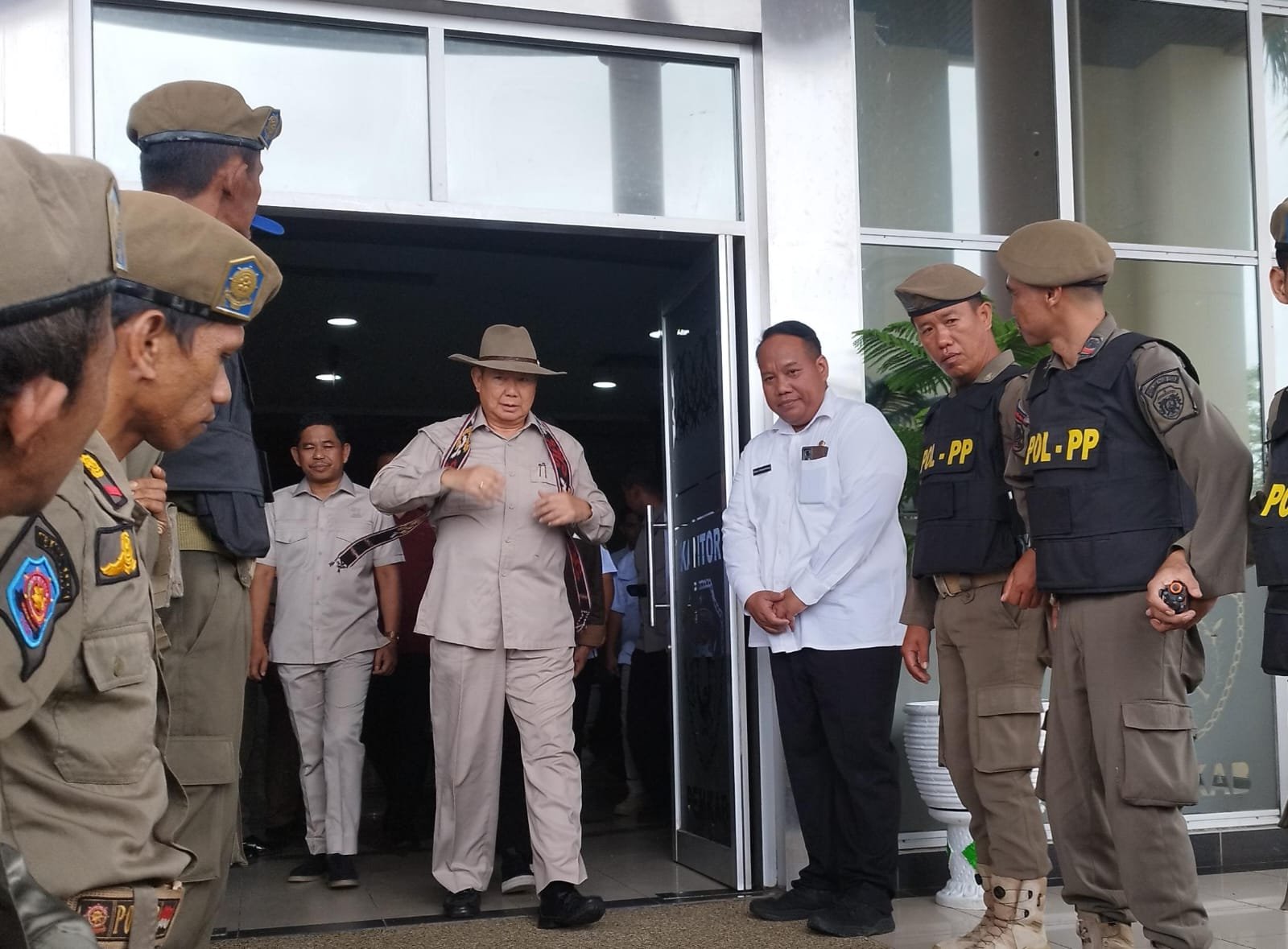 Pemilik Arsari Group, Hashim Djojohadikusumo saat meninggalkan Kantor Bupati PPU usai MoU pembangunan bendungan, Rabu (9/4/2025). -awal/disway-