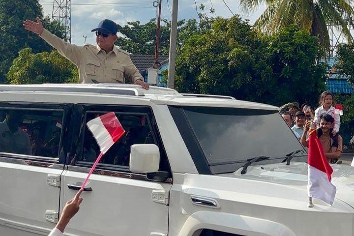 Presiden Prabowo Subianto yang terlihat mengenakan setelan khas berwarna cokelat, lengkap dengan topi berwarna biru tua dan kacamata hitam pun menyapa lewat atap terbuka di mobil tersebut.