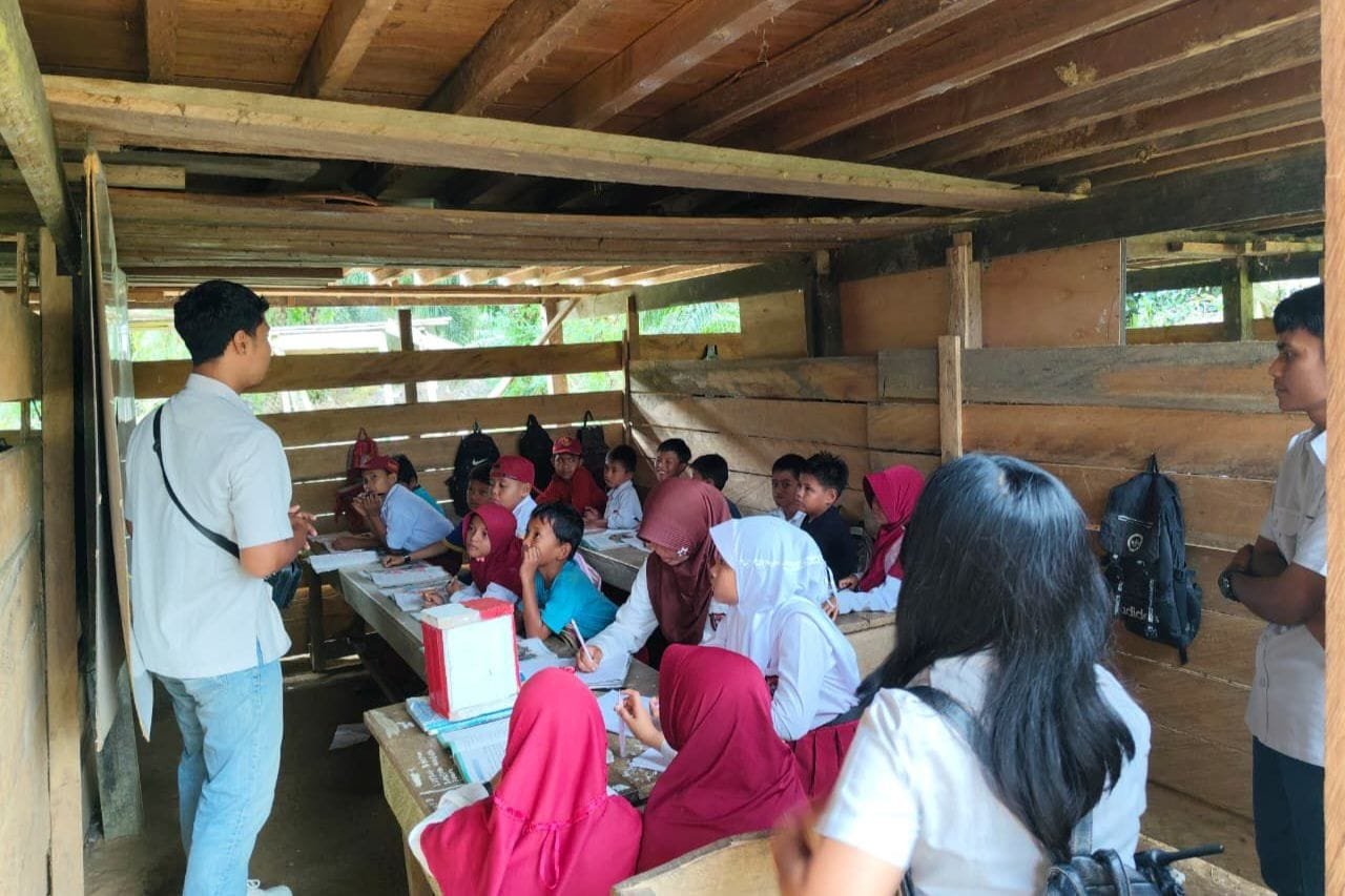 Akibatnya, proses belajar mengajar terpaksa dilakukan di bawah kolong rumah panggung milik warga. Ruang kosong di bawah rumah dijadikan kelas darurat agar kegiatan pendidikan tetap berjalan.